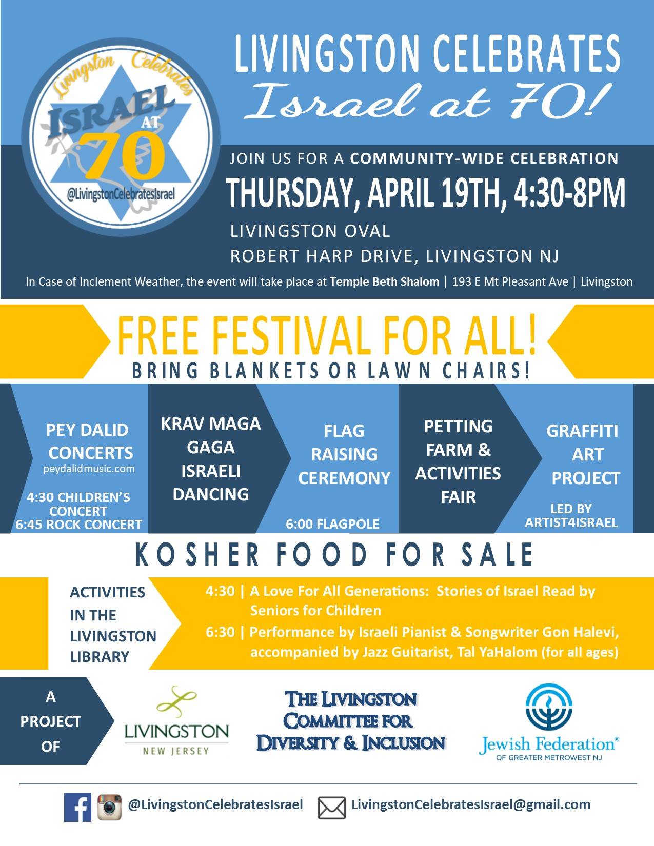 Livingston Celebrate Israel at 70! 19 Apr 2018 Livingston, NJ Details Venue : Livingston Celebrate Israel at 70! Address : 30 Robert Harp Drive State : NJ Zip : 07039